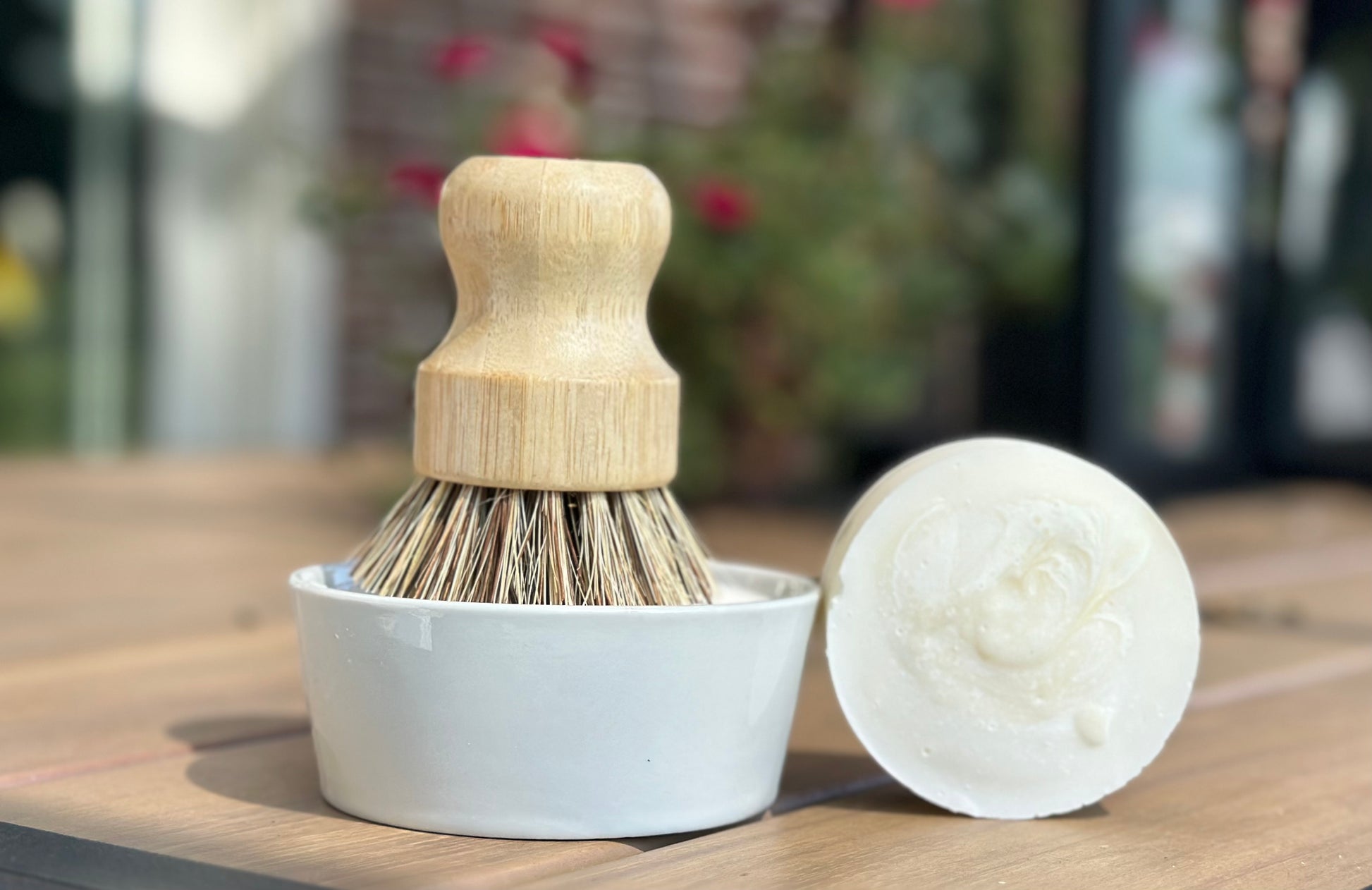 Purchase the full set (includes glass ramekin, soap, scrubber brush, and one refill) to get started, then simply buy refill blocks as needed!